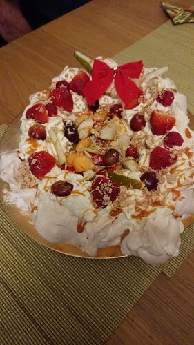 さて、メインでお腹いっぱいになったところへ、極限状態まで持っていくために、デザートで〆ます。 デザートは義母がパブロバを作ってきてくれたので、そちらがメインになります。 義母の作ったパブロバ 私は、ちょこっと端の彩りに、チョコの蝶のデコレーシ…